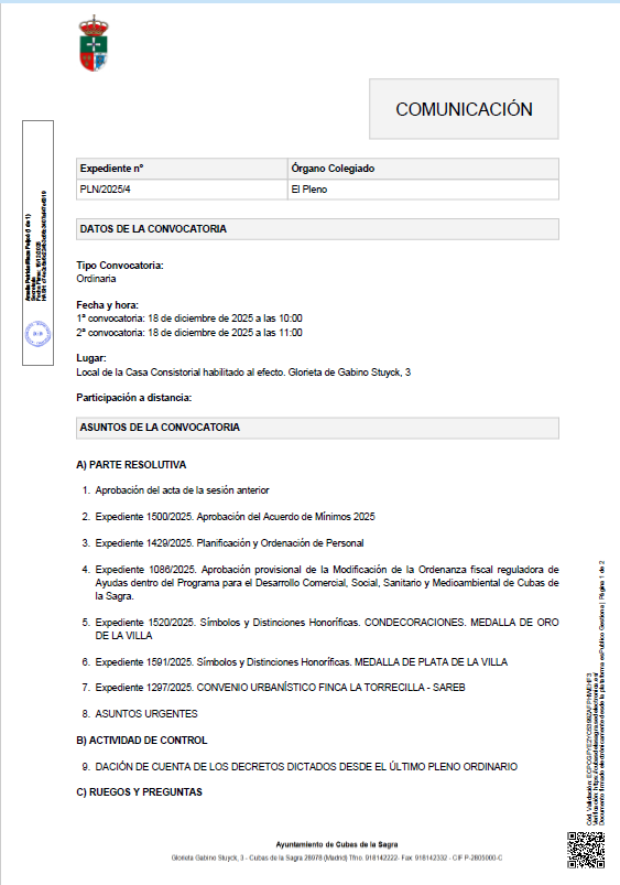 Tipo de Convocatoria: Extraordinaria urgente 9:00 horas.